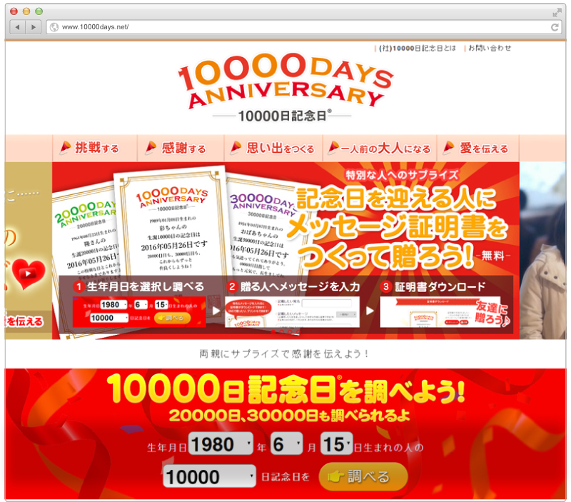 生年月日から、生誕10000日目、20000日目、30000日目の記念日を調べて
